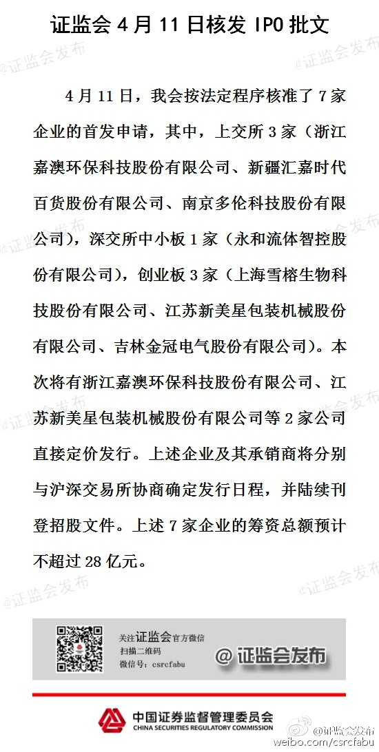 證監(jiān)會(huì)核發(fā)IPO批文:核準(zhǔn)7家企業(yè)首發(fā)申請(qǐng)